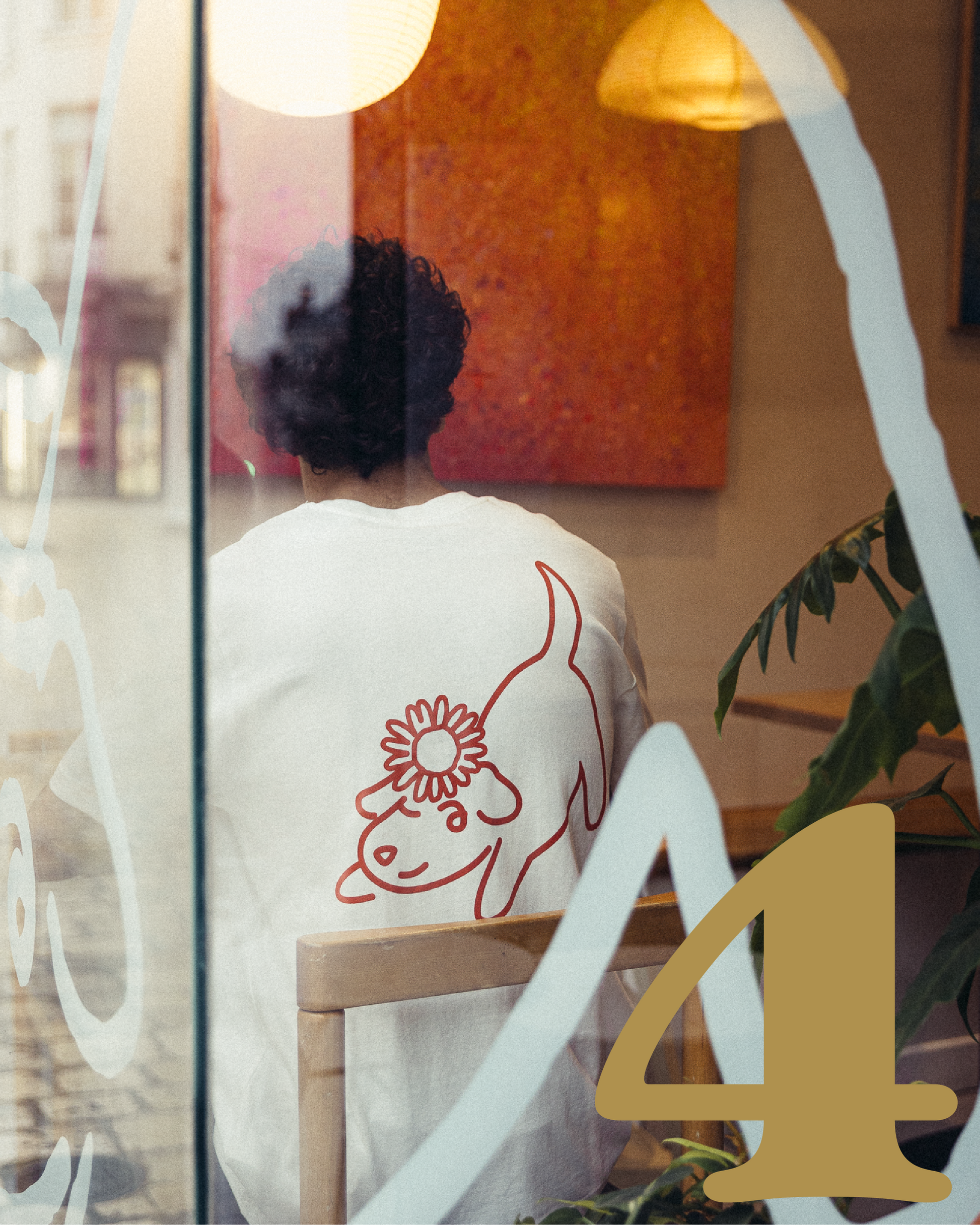 Dans le dos, son petit chien iconique, redessiné avec la fleur Onze Mètres Carrés comme clin d’œil.